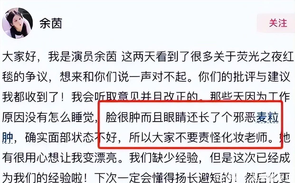 有些演员出了事之后团队都是第一时间否认,甚至还有律师函警告。余茵反而自己发了篇长文跟大家道歉,表示确实自己不太好看,这种坦诚倒是很难得。余茵是因为静态照片出了问题,那另一位女演员是在动态抓拍里,暴露了自己的“真面目”。