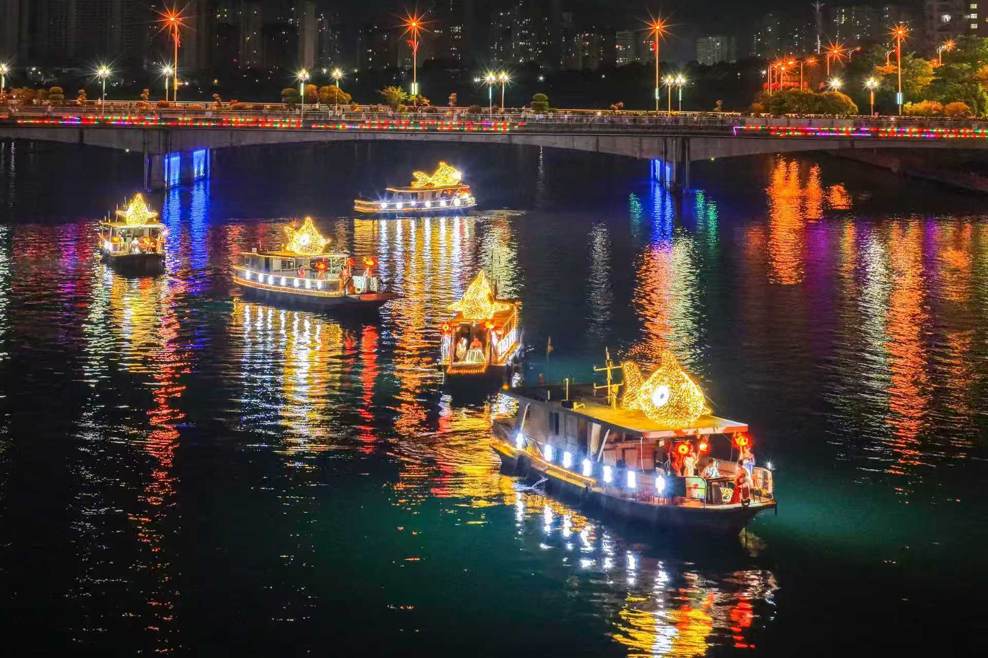 国庆中秋假期“乐游河源”文旅重头戏——“江湖渔火 太平夜市”河源第二届鱼灯夜游活动10月3日晚在河源市区新丰江畔盛大启幕。赏鱼灯、品美食、看表演……一系列丰富多彩的活动,吸引了众多市民、游客前来打卡游玩鼎际之家,点燃了河源国庆中秋假期文旅消费热潮。